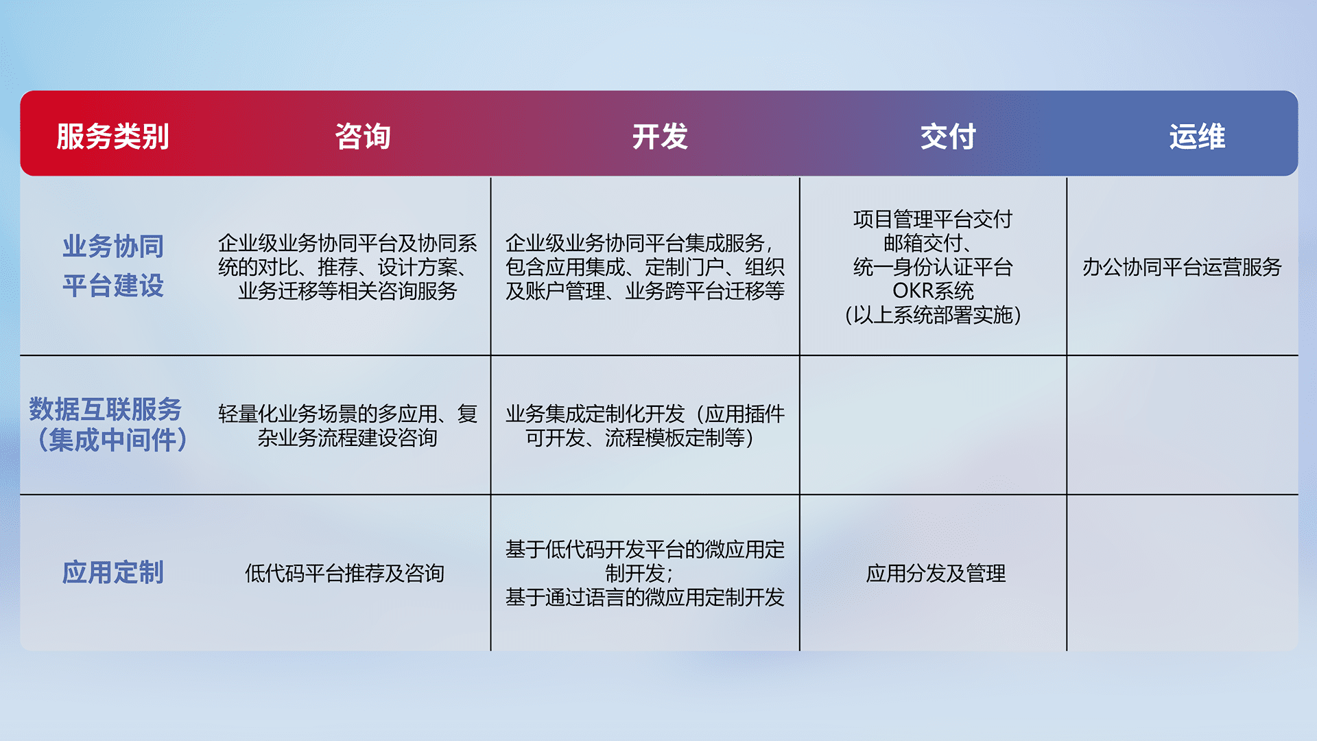 针对钉钉、、、、企微、、、IDaas等平台级产品提供产品的规划、、方案、、交付、、、、定制化开发等服务,,实现如统一协同办公、、、智能客户服务、、、混合会议管理、、智能数据查询、、、等业务场景,,,实现数字化转型。。