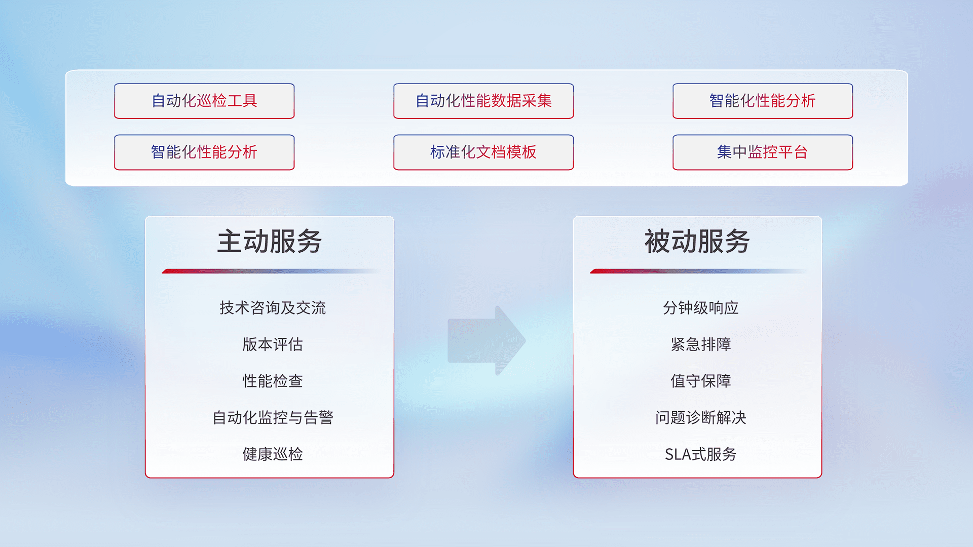 智能化工具和标准化文档,,,保障服务质量,,,提供主动服务(包含技术咨询、、版本评估、、、性能检查、、、自动化监控与告警、、、、健康巡检)和被动服务包含(分钟级响应、、紧急排障、、、、值守保障、、、问题诊断解决、、、SLA服务)。。。。